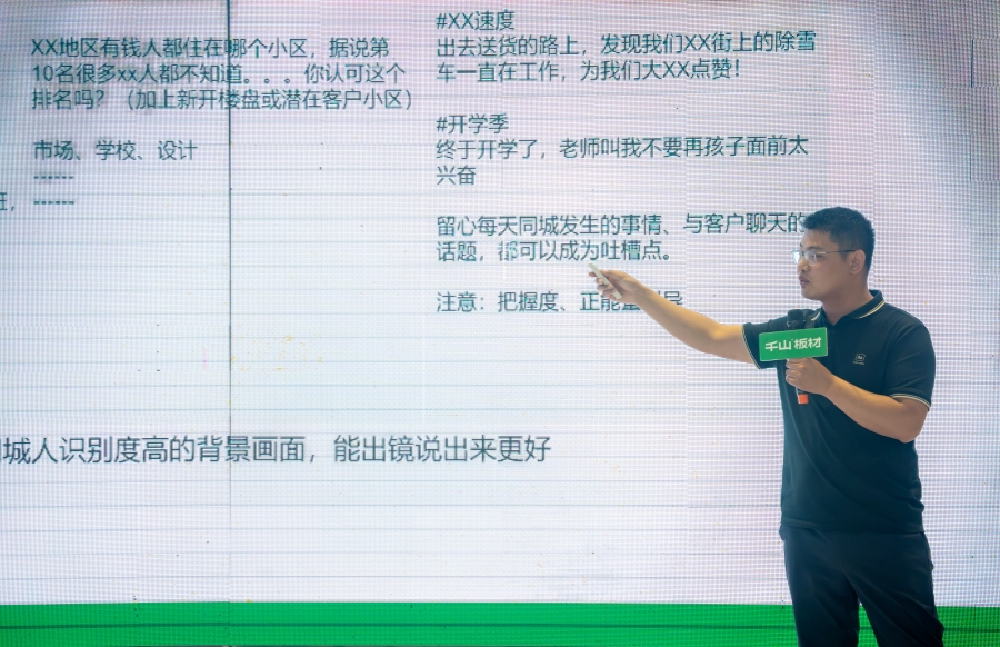 千山板材大區(qū)經理王殿忠致辭。王經理分享到,行業(yè)競爭壓力存在的同時也涌現(xiàn)出了機遇,千山將與伙伴們一起抓住機遇,形成事業(yè)共同體,多維度進擊,多渠道拓展,最終轉化為效益增長。