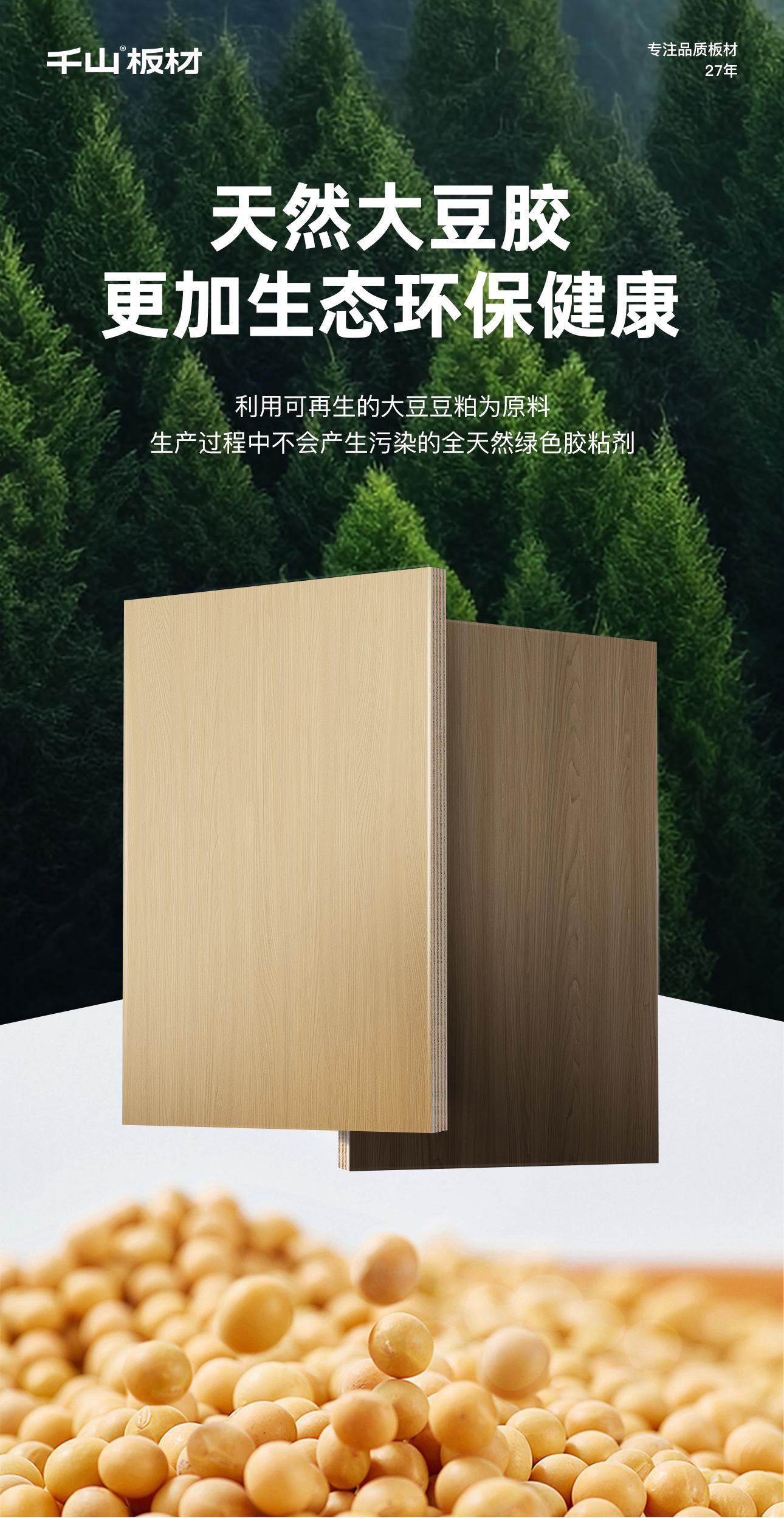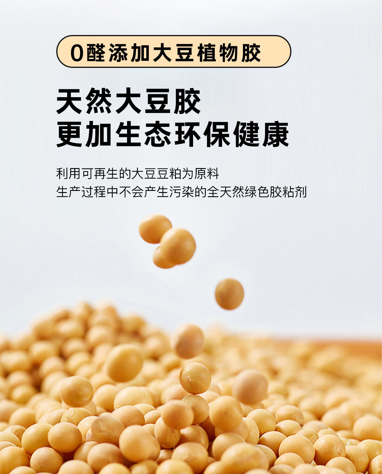 千山大豆膠板材利用大豆分子改性技術(shù),解決傳統(tǒng)大豆膠的耐水性、膠合性缺陷,具有更好地粘合性能,提升了板材的膠合強(qiáng)度、耐水性及靜曲強(qiáng)度,保證板材的抗變形、防潮防霉、不易老化性能,延長(zhǎng)使用壽命。